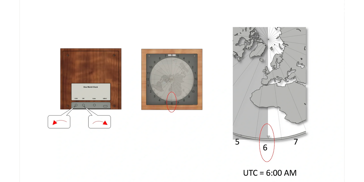 Once the current time at UTC has been set (see “How do I set the time” above) the time can at any location be determined by following the desired location outward to the numbers surrounding the clock.